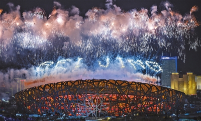 在盲童合唱团孩子们天籁般的歌声中,“北京2022”字样的焰火在体育场上空绽放。
