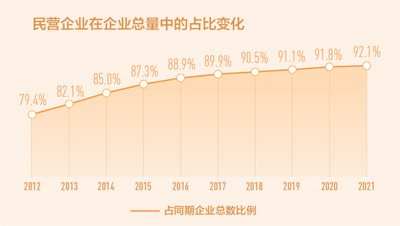 记者近日从国家市场监督管理总局获悉:2012—2021年,我国民营企业数量从1085.7万户增长到4457.5万户,10年间翻了两番,民营企业在企业总量中的占比由79.4%提高到92.1%,在稳定增长、促进创新、增加就业、改善民生等方面发挥了重要作用,成为推动经济社会发展的重要力量。