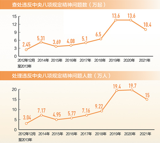 寸步不让纠“四风”,真管真严抓作风。数据显示,2021年全国共查处违反中央八项规定精神问题104223起,批评教育帮助和处理150362人,其中党纪政务处分101224人。
