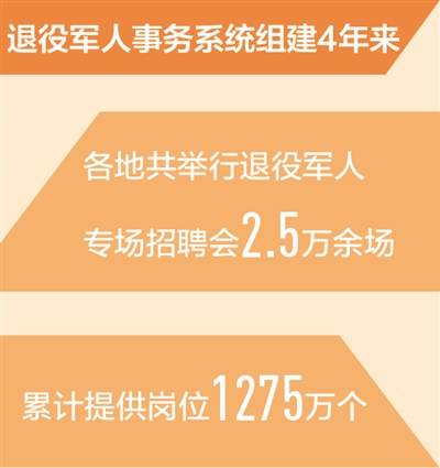 记者从退役军人事务部了解到:退役军人事务系统组建4年来,全国各地共举行退役军人专场招聘会2.5万余场,累计提供岗位1275万个,帮助226万名退役军人实现就业。
