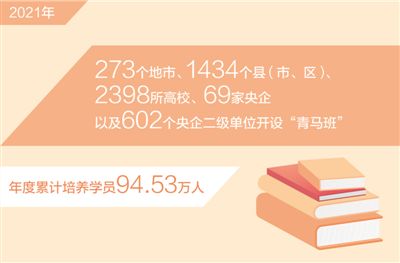 “青马工程”旨在为党培养信仰坚定、能力突出、素质优良、作风过硬的青年政治骨干。截至目前,31个省(区、市)和新疆生产建设兵团全部开展“青马工程”,29个省级团委在原有高校班基础上,增设了省级国企班、农村班、社会组织班、少先队工作者班等班次。2021年全年,共有273个地市、1434个县(市、区)、2398所高校、69家央企以及602个央企二级单位开设“青马班”,年度累计培养学员94.53万人,充分展现了“青马工程”作为共青团思想引领、推优荐才重要平台的强大生命力。