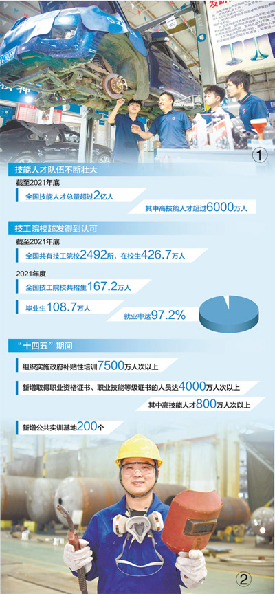人社部数据显示,截至2021年底,全国共有技工院校2492所,今年计划招生140万人以上。人社部提出,力争到“十四五”末,建设100个工学一体化培养模式专业,推动1000所技工院校参与实施工学一体化培养模式,让技工院校更好成为技能人才“孵化器”。