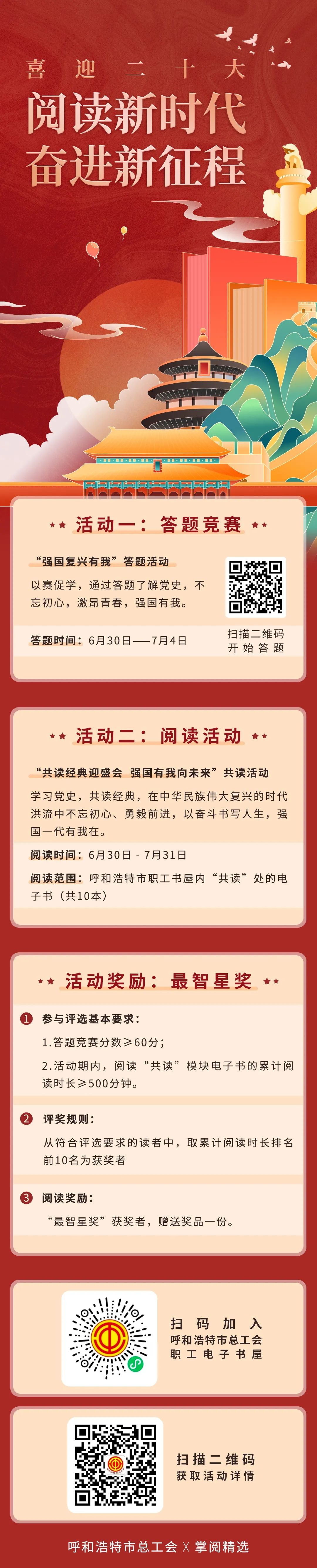 为迎接党的二十大胜利召开,推进全民阅读活动深入开展,值此七一建党节来临之际,呼和浩特市总工会面向全市职工开展“喜迎二十大 阅读新时代 奋进新征程”全民阅读活动。