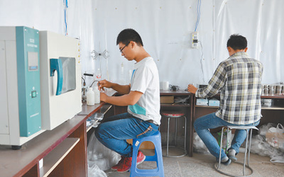 胡树文团队的研究生在试验站里检测土壤样本。