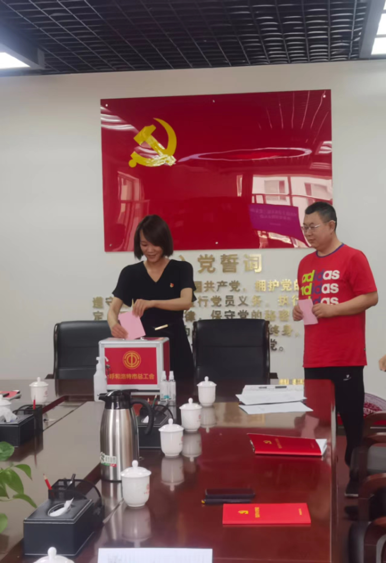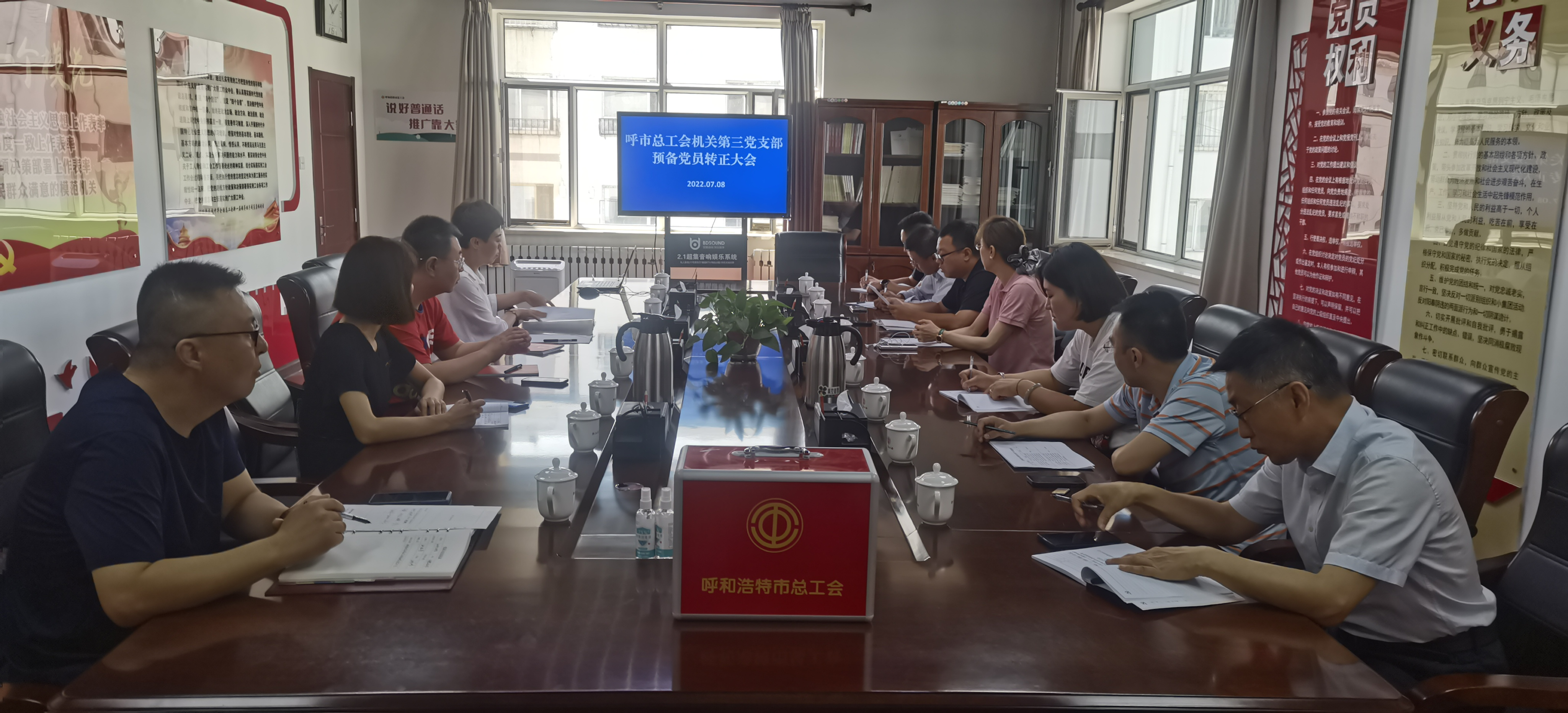 7月8日上午,呼和浩特市总工会机关第三党支部召开党员大会,讨论鲍冠鹏同志预备党员转正等事项,支部书记钟晓芳主持会议。