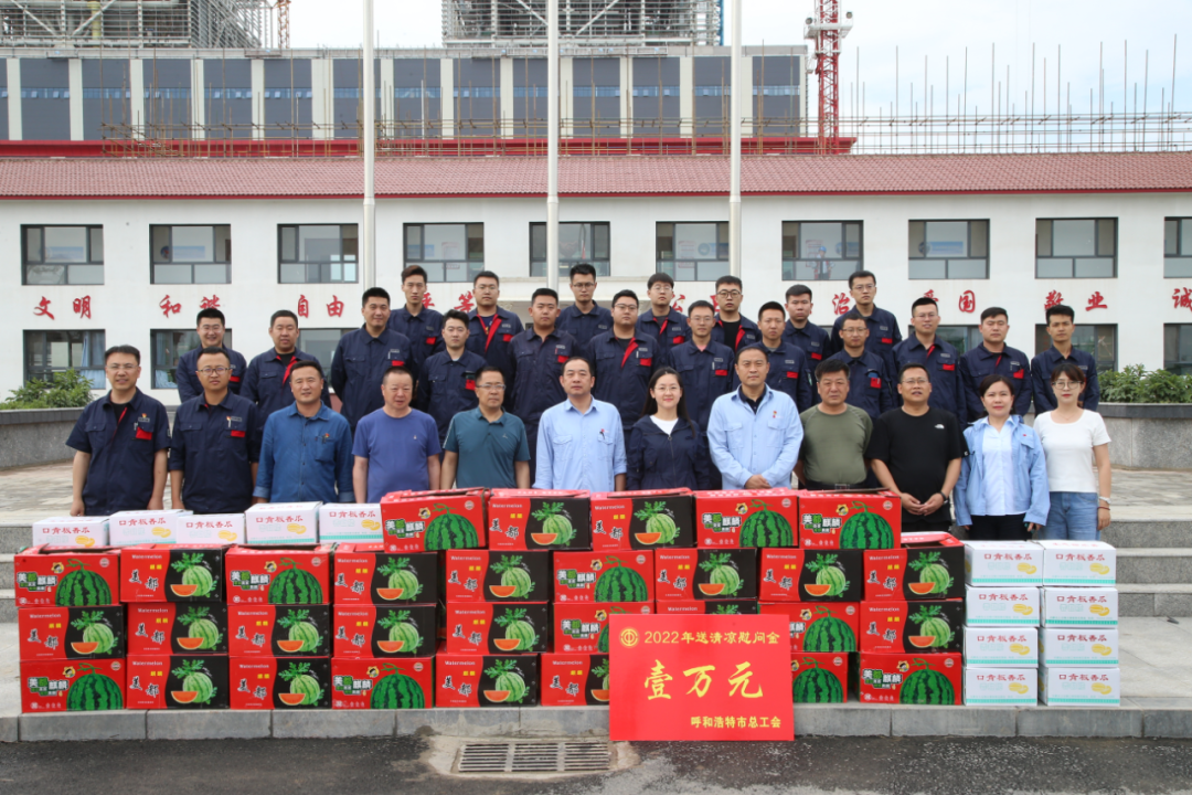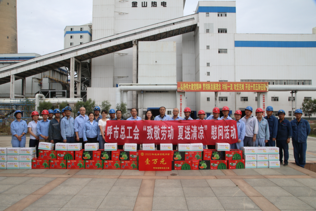 慰问组一行对金山热电公司高温一线作业人员和热电公司二期户外高温施工人员进行了慰问,并为高温期间奋战在一线的职工送去价值1万元的慰问物资,随后参观了该公司的全国模范职工之家和热电二期集控室,公司领导介绍了金山热电公司二期工程概况及高温期间户外施工职工安全劳动保护措施、企业经营状况、产业工人队伍建设改革等情况。云娜说,内蒙古金山热电有限公司是全市重要的热电联产单位,职工长期在生产性热源高温作业,奋战在一线岗位,任务重、责任大、工作强度大,工会要时刻把职工的生产安全和所需所想放在心上,充分发挥好党和政府联系职工群众的桥梁纽带作用,要让职工深切感受到工会是职工最信赖的娘家人。开展“致敬劳动、夏送清凉”慰问活动,是市总工会关心、关爱职工的一项重要举措,主要是为广大高温一线职工带去党和政府的关怀,希望广大职工进一步增强主人翁意识,爱岗敬业,以坚定的信心、饱满的热情和奋发向上的精神状态积极投身到首府经济高质量发展中,为喜迎二十大的胜利召开做出应有的贡献。