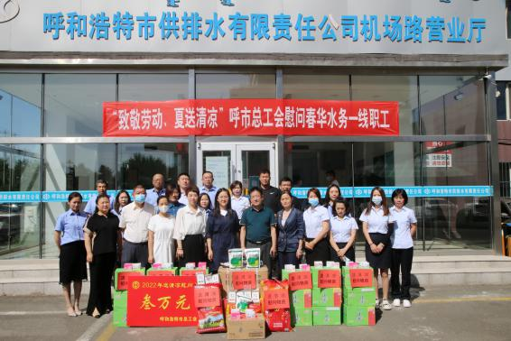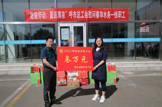 为做好夏季高温条件下的防暑降温工作,切实保障广大职工的健康权益。7月14日上午,呼和浩特市总工会深入呼和浩特春华水务集团公司开展2022年“致敬劳动、夏送清凉”慰问活动,为坚持在高温下辛苦工作的保障全市供水的一线职工送去价值3万元的解暑防暑用品。市总工会党组成员、副主席云娜一行参加慰问活动并与一线职工代表座谈,春华水务集团公司党委副书记、工会主席冯德等相关人员陪同慰问。