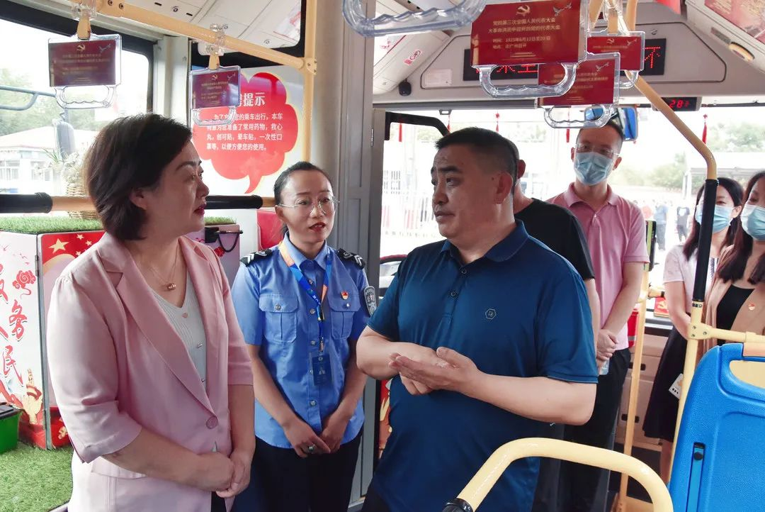云玉美会同公交公司领导首先为获得“全国工人先锋号”的K1路揭牌,并为内蒙古自治区五一劳动奖章获得者第四公共汽车公司驾驶员刘海燕颁发奖章和证书。随后参观了“工人先锋号”文化车厢,对文化车厢的布置提出了建议。