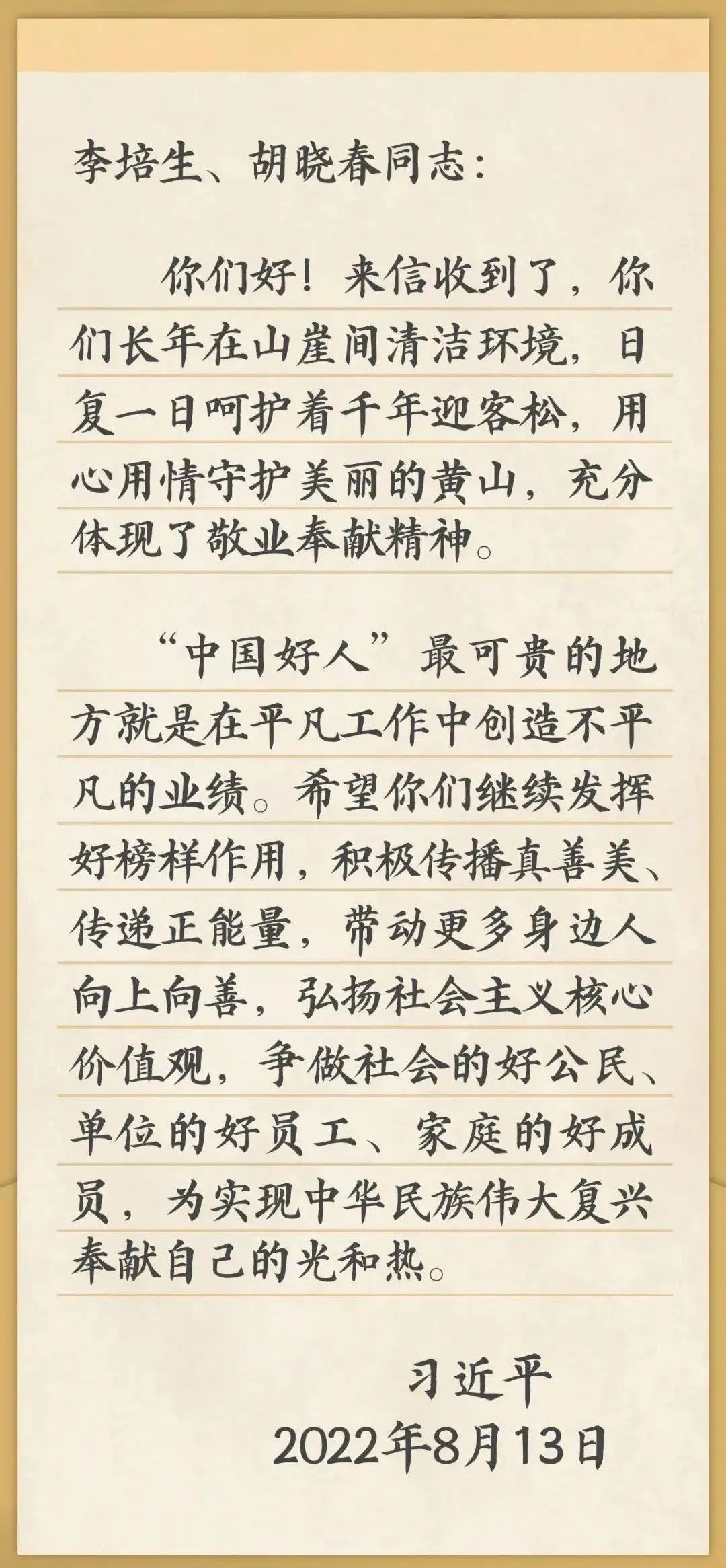 “真没有想到习近平总书记给我们回信了,这份巨大的鼓舞不仅是给我们俩,也是给黄山的,更是给所有‘中国好人’的。”接到书信的李培生和胡晓春,前行的动力十足。