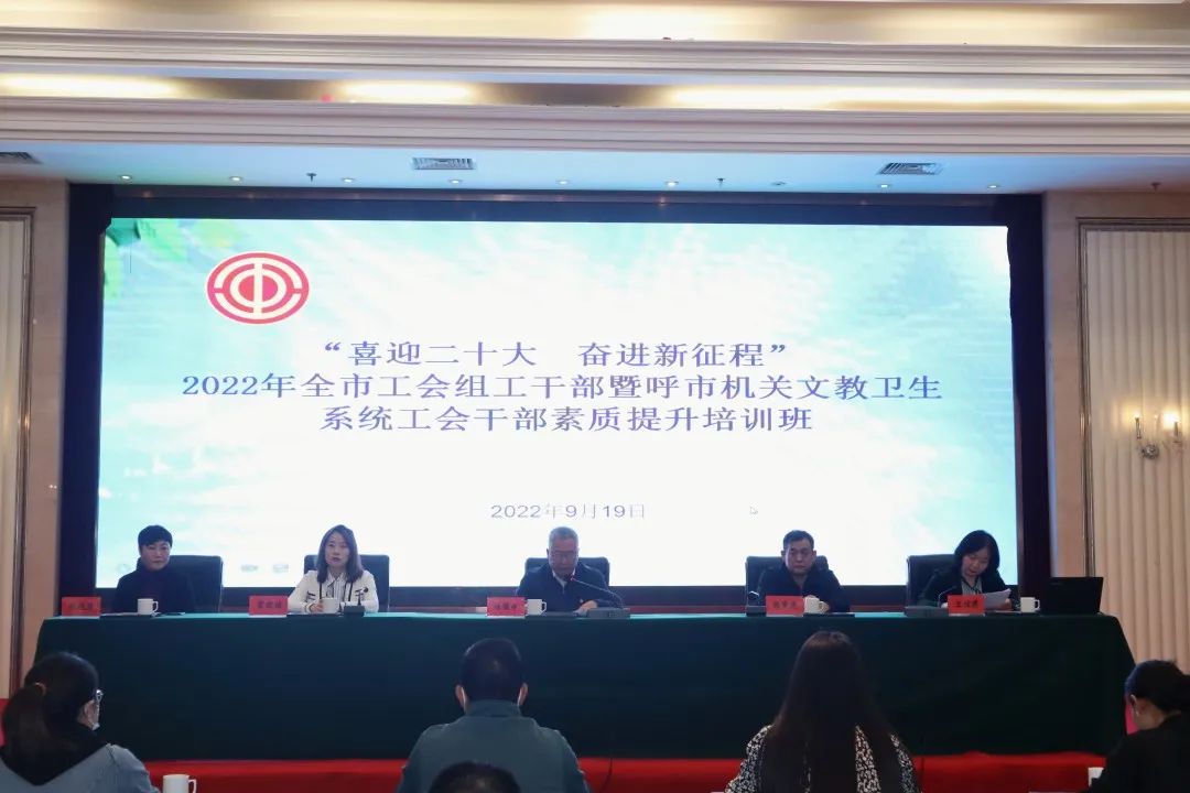 为深入学习贯彻落实习近平新时代中国特色社会主义思想,贯彻党的十九大和十九届历次全会精神,深入领会习近平总书记关于工人阶级和工会工作的重要论述,稳步推进全市工会“揭榜领题”工作,全面提升全市组工干部和全市机关文教卫生系统工会干部业务素质和履职能力,打造高素质、专业化的工会干部队伍,9月19日,呼和浩特市总工会举办“喜迎二十大 奋进新征程”2022年全市工会组工干部暨呼市机关文教卫生系统工会干部素质提升培训班。市总工会党组书记、副主席汪俊亭,内蒙古职工互助保障协会秘书长杨章虎,自治区总工会干部学校副教授常晓媛,市总工会组织部部长王佳慧,市机关文教卫生工会负责人张艳君出席了开班仪式 。