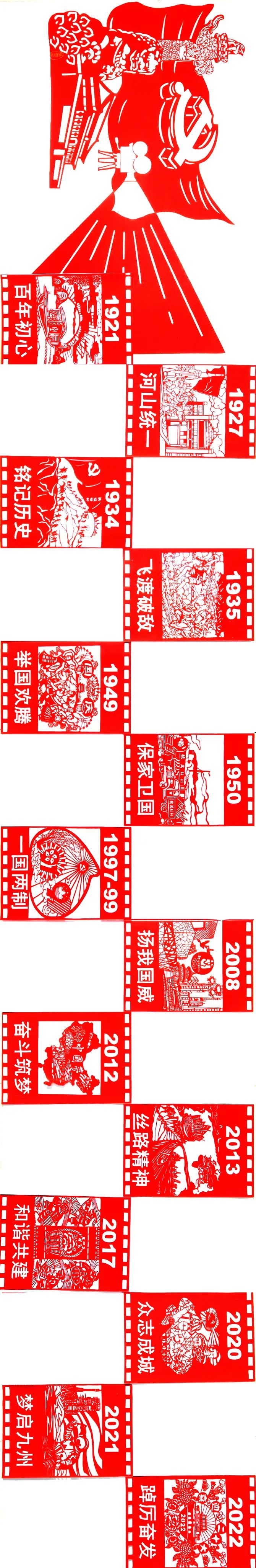 创作说明:收集整理了1921年中国共产党成立至今所发生重大事件的文字资料,从中筛选出十四件最具影响力的事件,并形成剪纸模板。其中包括:1921年中国共产党成立、1927年南昌起义、1934年红军长征、1935年飞夺泸定桥、1949年新中国成立、1950年抗美援朝、1997年香港回归、1999年澳门回归、2008年北京奥运会、2012年习近平总书记"中国梦"的提出、2013年一带一路、2017年小康社会向第二个百年奋斗目标进军、2020年抗击新冠、2021年中国航天续写辉煌、2022年党的二十大胜利召开。将党的百年发展史刻画成一部影片,每一个重大事件同样也是一部完整的胶片,作品包含天安门、华表、石狮子、党旗等元素,放映机在党旗的映衬下放映出来一幅幅美丽的画卷,从这些剪纸中,可以看到电影胶片的身影,看到百年红船、红军爬雪山、飞夺泸定桥,看到56个民族载歌载舞欢庆中华人民共和国成立、劳动者们对生活和劳动的热爱之情,看到鸟巢、水立方等现代建筑,看到航天员登月的壮观场景,看到全国人民特别是“青城人民”在习近平总书记的带领下抗击疫情的决心...