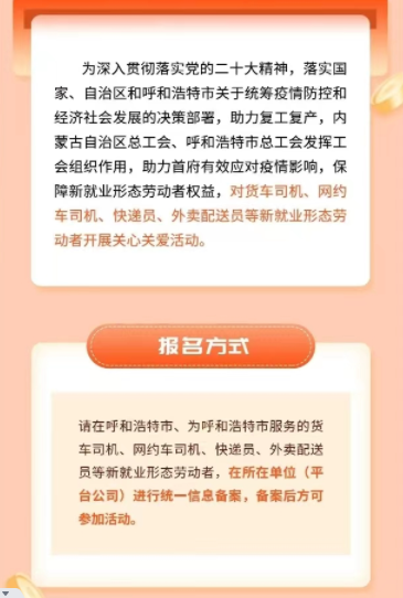 报名方式:请在呼和浩特市,为呼和浩特市服务的货车司机、网约车司机、快递员、外卖配送员等新就业形态劳动者,在所在单位(平台公司)进行统一信息备案,备案后方可参加活动。