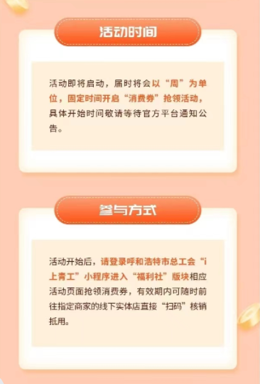 参与方式:活动开始后,请登录呼和浩特市总工会“i上青工”小程序进入“福利社”版块相应活动页面抢领消费劵,有效期内可随时前往指定商家的线下实体店直接“扫码”核销抵用。