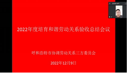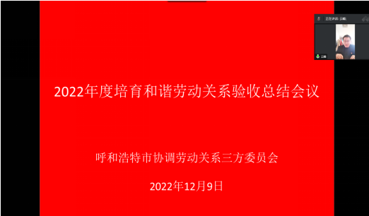 为进一步打造和谐企业,推动和谐劳动关系创建。按照呼和浩特市“和谐同行”企业培育共同行动工作要求,12月9日下午,市总工会、人社局、工商联和发改委等单位对列入我市2022年培育名单的企业开展线上验收总结会议。
