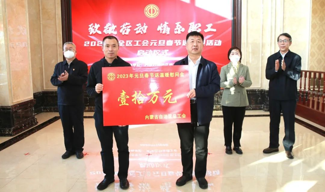 启动仪式上,张慧宇讲话并宣布2023年全区工会“两节”送温暖活动启动,呼和浩特市春华水务开发集团有限责任公司负责人发言。在场领导向现场保供企业的一线技术工人、劳动模范和困难职工代表发放党的二十大学习资料、慰问品,并向企业送去慰问金。