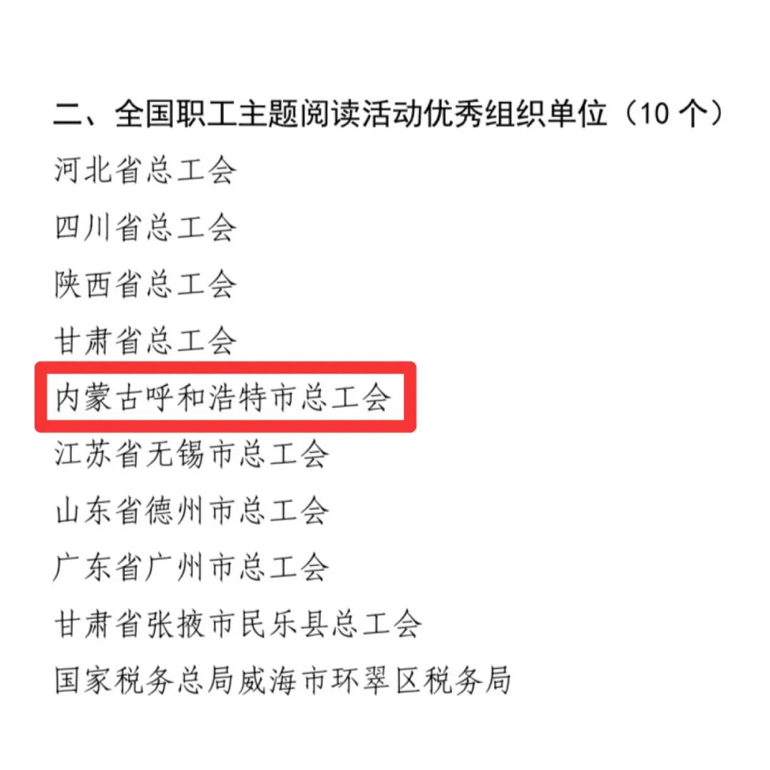 12月28日,全国工会职工书屋建设领导小组办公室、全国总工会宣传教育部发布了职工书屋建设典型成果通报。呼和浩特市总工会荣获“全国职工主题阅读活动优秀组织单位”称号;内蒙古蒙草生态环境(集团)股份有限公司职工书屋荣获“全国工会品牌职工书屋示范点”称号。