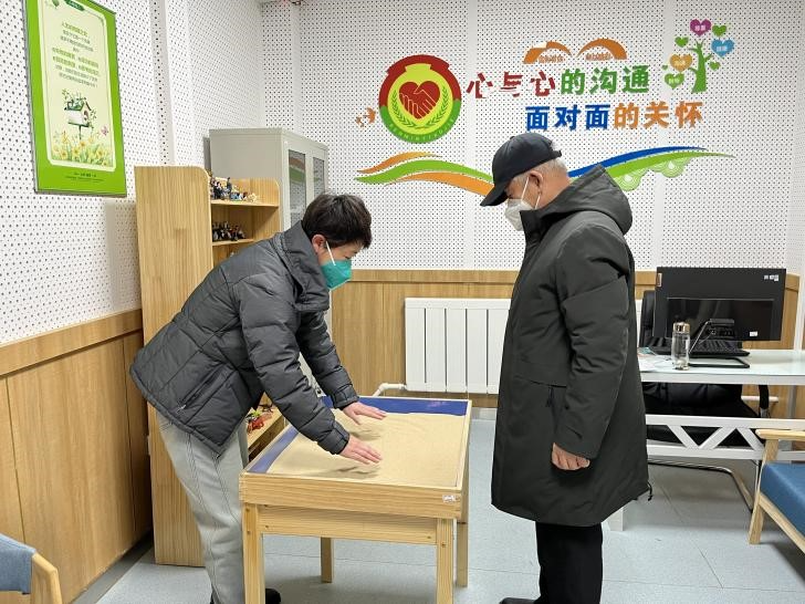 上图为心理咨询师正在为一位上访老人做沙盘游戏,通过沙盘游戏逐渐使老人激动的心情平复下来……