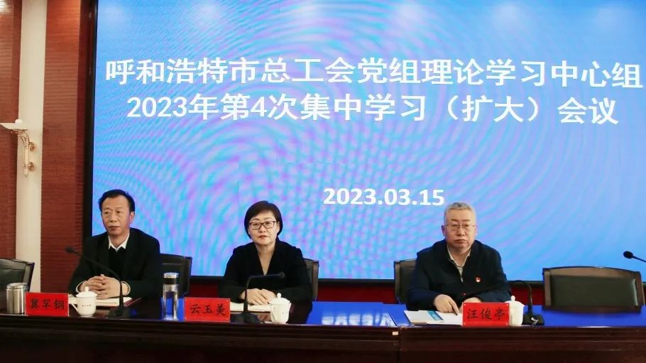 3月15日,呼和浩特市总工会召开理论学习中心组2023年第4次集中学习(扩大)会议。市人大常委会副主任、总工会主席云玉美、市总工会党组成员、副主席冀罕钢参加学习,市总工会党组书记、副主席汪俊亭主持会议。