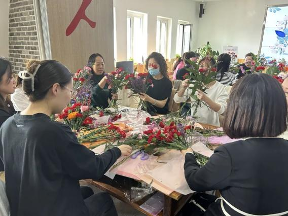杜倩老师为现场女职工详细讲授了花艺知识,从鲜花品种、色彩搭配、修剪造型、实操技巧等方面进行了细致讲解,并在现场做了生动的插花演示。