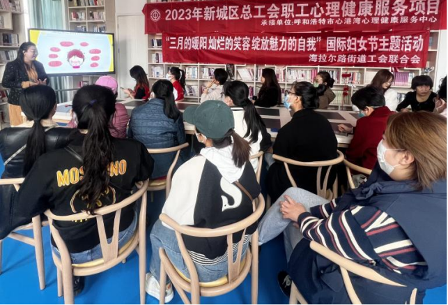 为庆祝“三八”国际妇女节,丰富女职工精神文化生活,促进女职工身心健康发展。3月8日,新城区总工会委派呼和浩特市心港湾心理健康服务中心国家二级心理咨询师牛志红老师在海拉尔街道办事处公主府社区为职工开展“三月的暖阳,灿烂的笑容,绽放魅力的自我”妇女节主题活动。