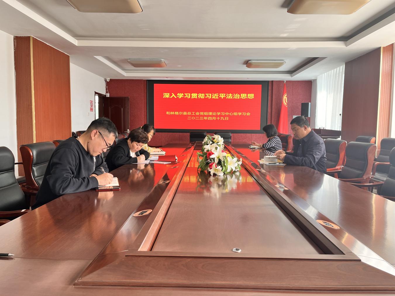 4月19日上午,县总工会党组理论学习中心组召开深入学习贯彻习近平法治思想学习会,党组书记伊俊文主持并领学。