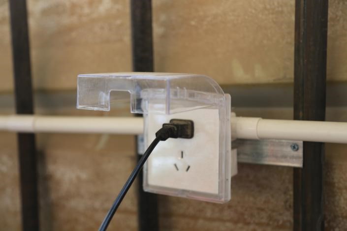 (安装充电桩前,广厦西车棚靠无序垂挂的插座充电,有时一个插座上同时给多个电动车充电,安全问题仅靠车棚管理人员管控,线路不整齐、无过载断电装置和防雨装置,存在安全隐患。)