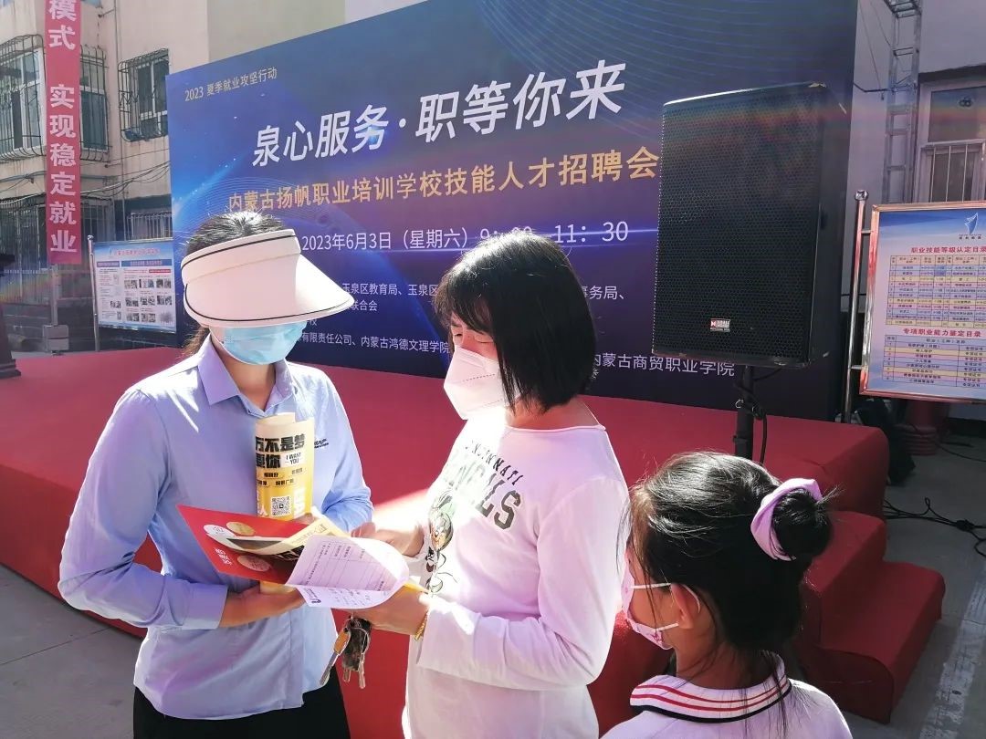 为深入贯彻落实党的二十大精神,充分发挥工会组织作为党联系职工群众桥梁纽带作用,推动实现更加充分更高质量的就业,支持多渠道灵活就业,突出抓好重点群体就业服务,6月3日,由玉泉区人力资源和社会保障局、玉泉区教育局、玉泉区总工会、玉泉区退役军人事务局、玉泉区妇女联合会、玉泉区残疾人联合会主办,内蒙古鸢飞人力资源有限责任公司、内蒙古鸿德文理学院、内蒙古丰州职业学院、内蒙古商贸职业学院协办,内蒙古扬帆职业培训学校承办的2023 夏季就业攻坚行动“泉心服务·职等你来”技能人才招聘会,在内蒙古扬帆职业培训学校举办。