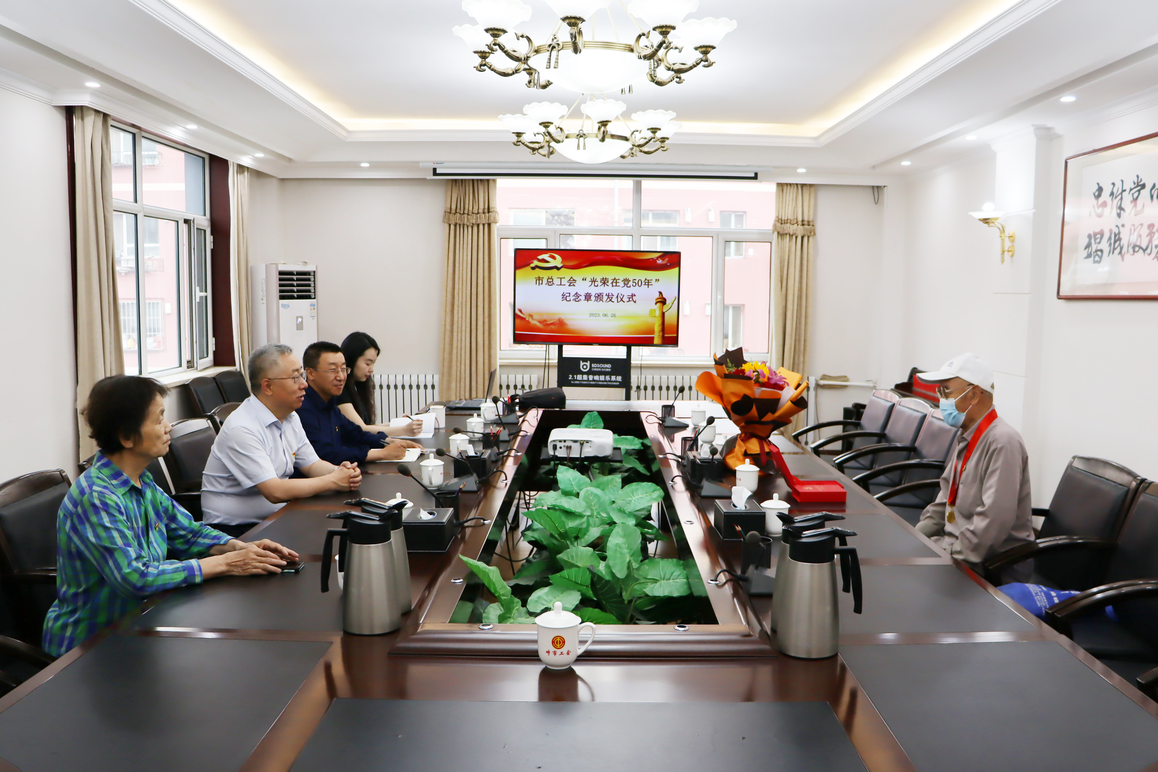 汪俊亭代表机关全体党员干部向老党员马瑞荣获“光荣在党50年”纪念章表示热烈祝贺,对他为首府工运事业的发展作出的积极贡献表示崇高敬意,衷心希望老党员继续发挥自身优势,为工会工作积极建言献策。