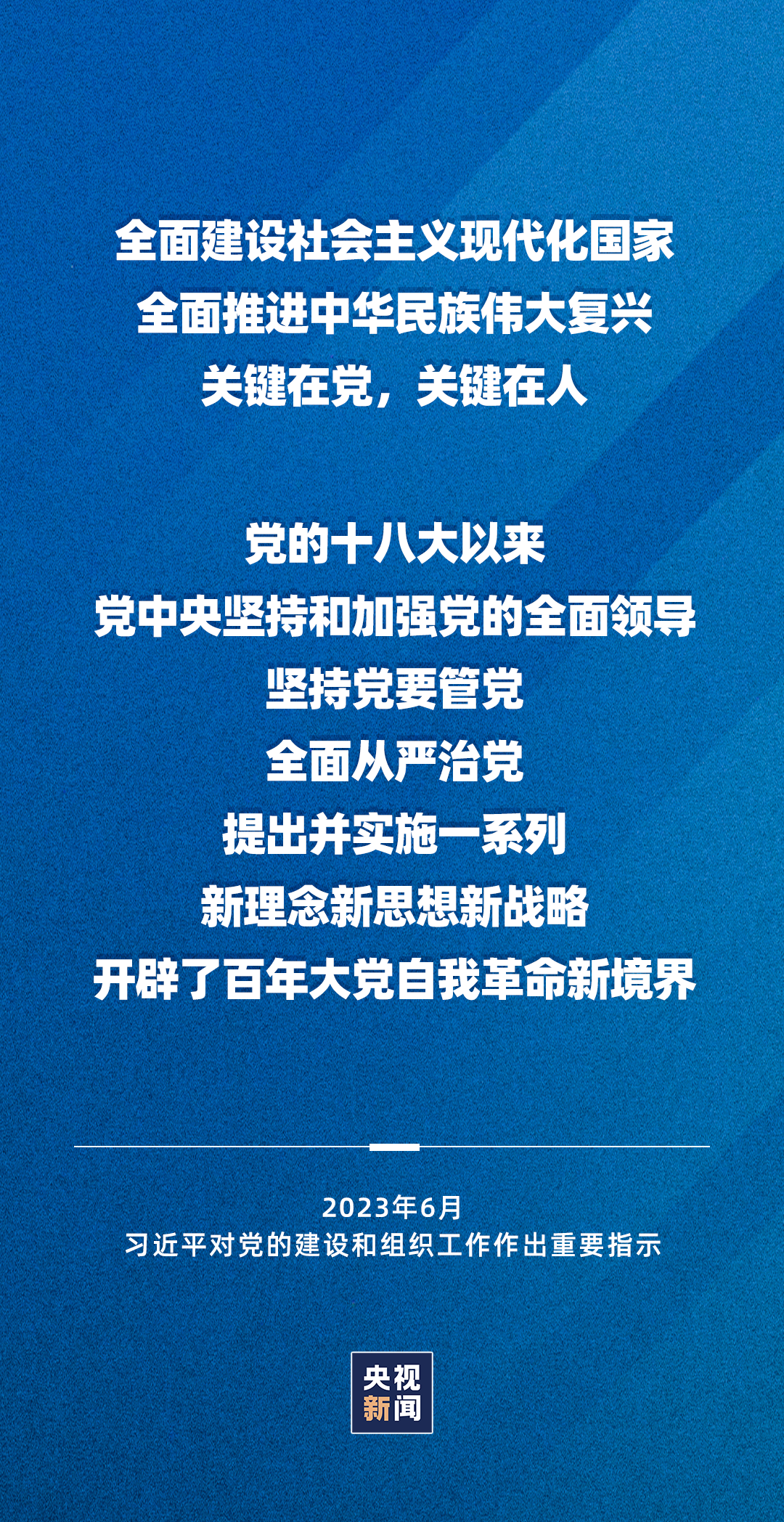 习近平强调,实现党在新时代新征程的使命任务,党的建设和组织工作要有新担当新作为。要坚持以新时代中国特色社会主义思想为指导,全面贯彻党的二十大精神,深刻领会党中央关于党的建设的重要思想,深入落实新时代党的建设总要求和新时代党的组织路线,深入推进新时代党的建设新的伟大工程,以坚持和加强党中央集中统一领导为最高原则,以忠诚为党护党、全力兴党强党为根本使命,以解决大党独有难题、健全全面从严治党体系为重大任务,坚持不懈用党的创新理论统一全党思想意志行动,不断严密上下贯通、执行有力的组织体系,着力建强堪当民族复兴重任的高素质执政骨干队伍,加快建设世界重要人才中心和创新高地,持续深化模范部门和过硬队伍建设,不断提高组织工作质量,为更好地以党的伟大自我革命引领伟大社会革命,推进强国建设、民族复兴伟业提供坚强组织保证。
