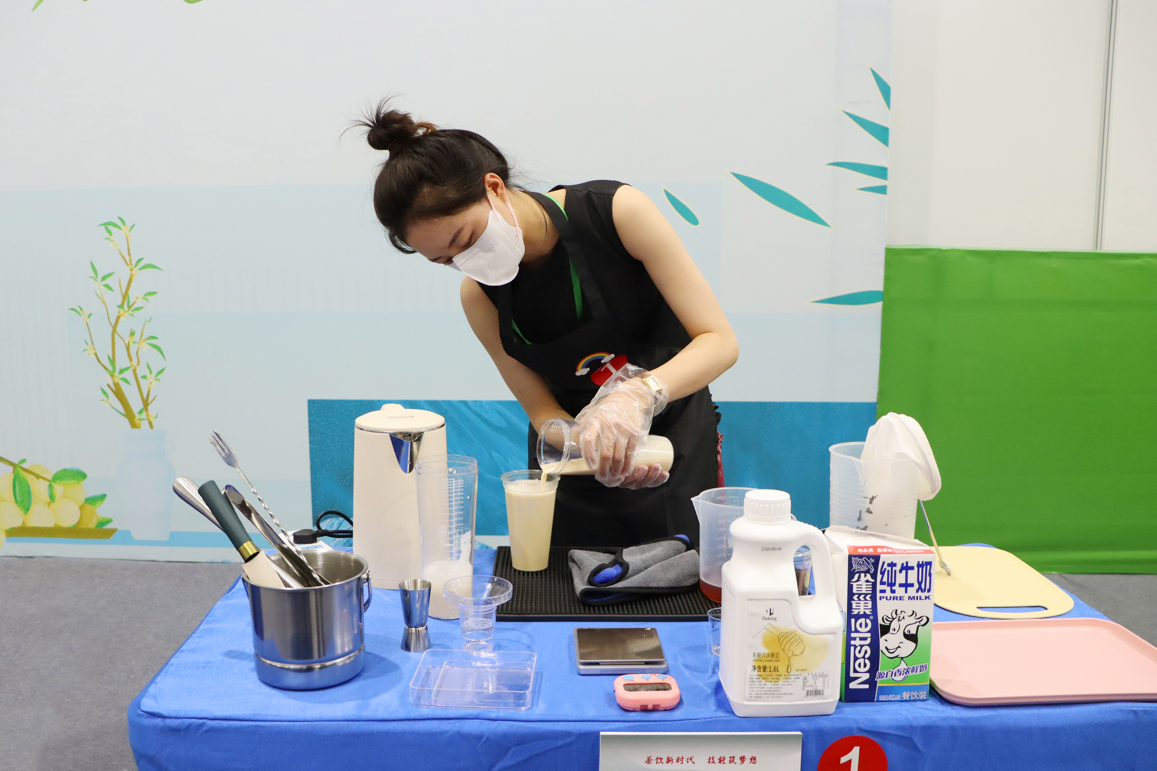 在大赛现场,调饮师们对茶叶、水果、奶及其制品等原辅料通过色彩搭配、造型和营养成分配比等技术手法,调制出了一杯杯口味多元化调制饮品。