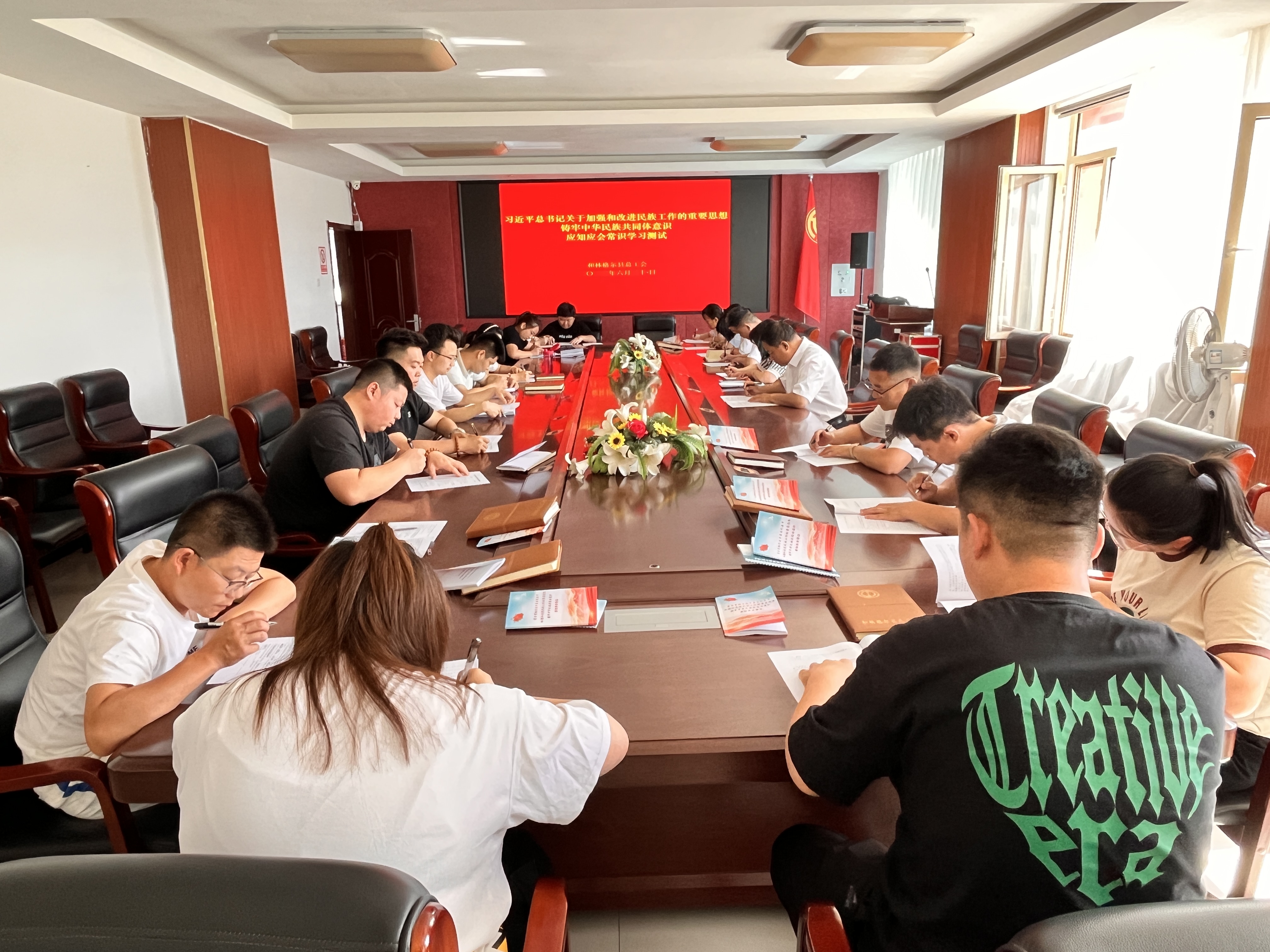本次集中晨学和现场闭卷测试的内容主要为习近平总书记关于加强和改进民族工作的重要思想、铸牢中华民族共同体意识应知应会常识、党的民族工作理论、民族政策、法规等。集中学习后,通过闭卷考试的方式,对全体干部职工的民族团结创建知识进行测试。