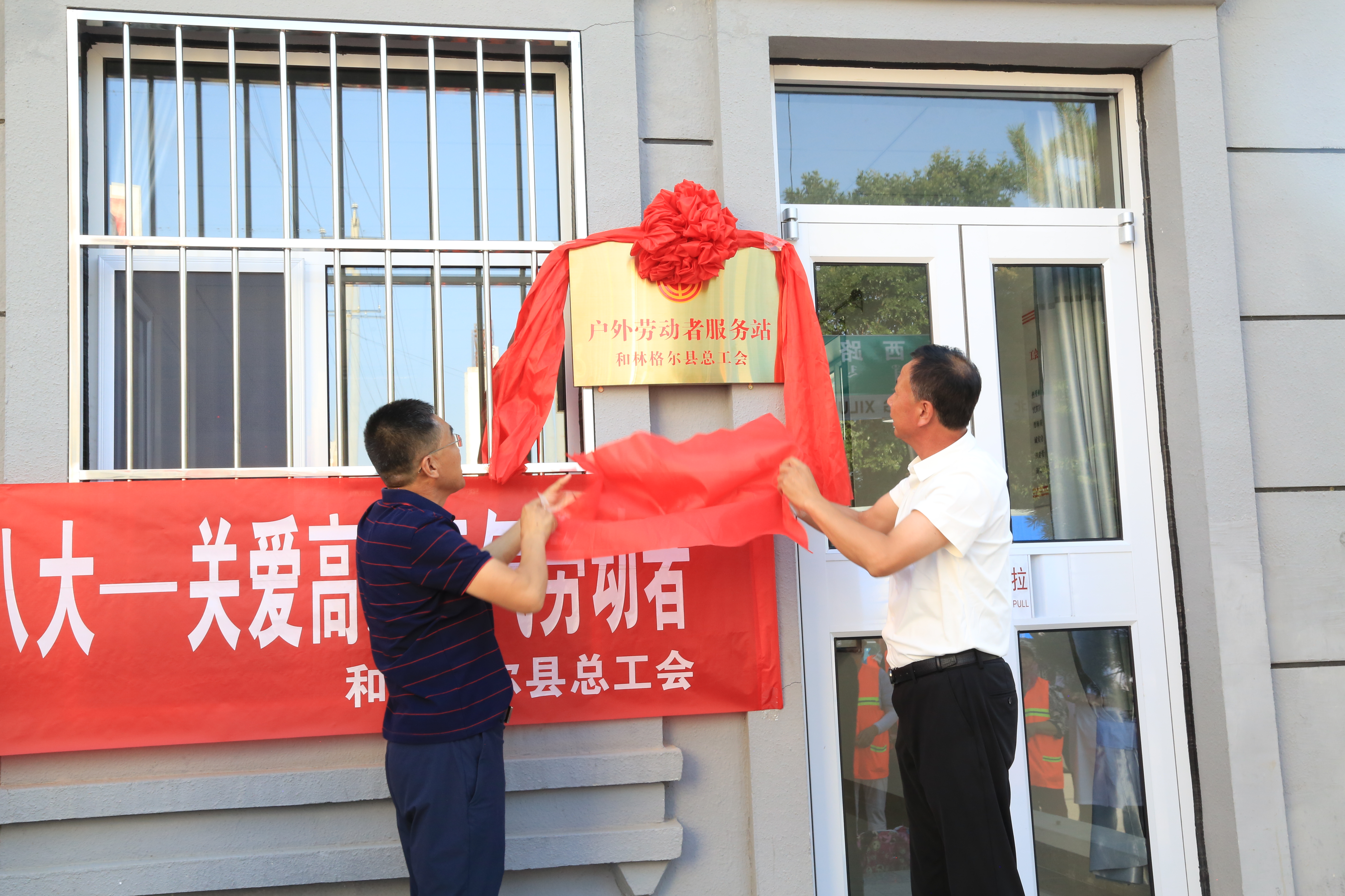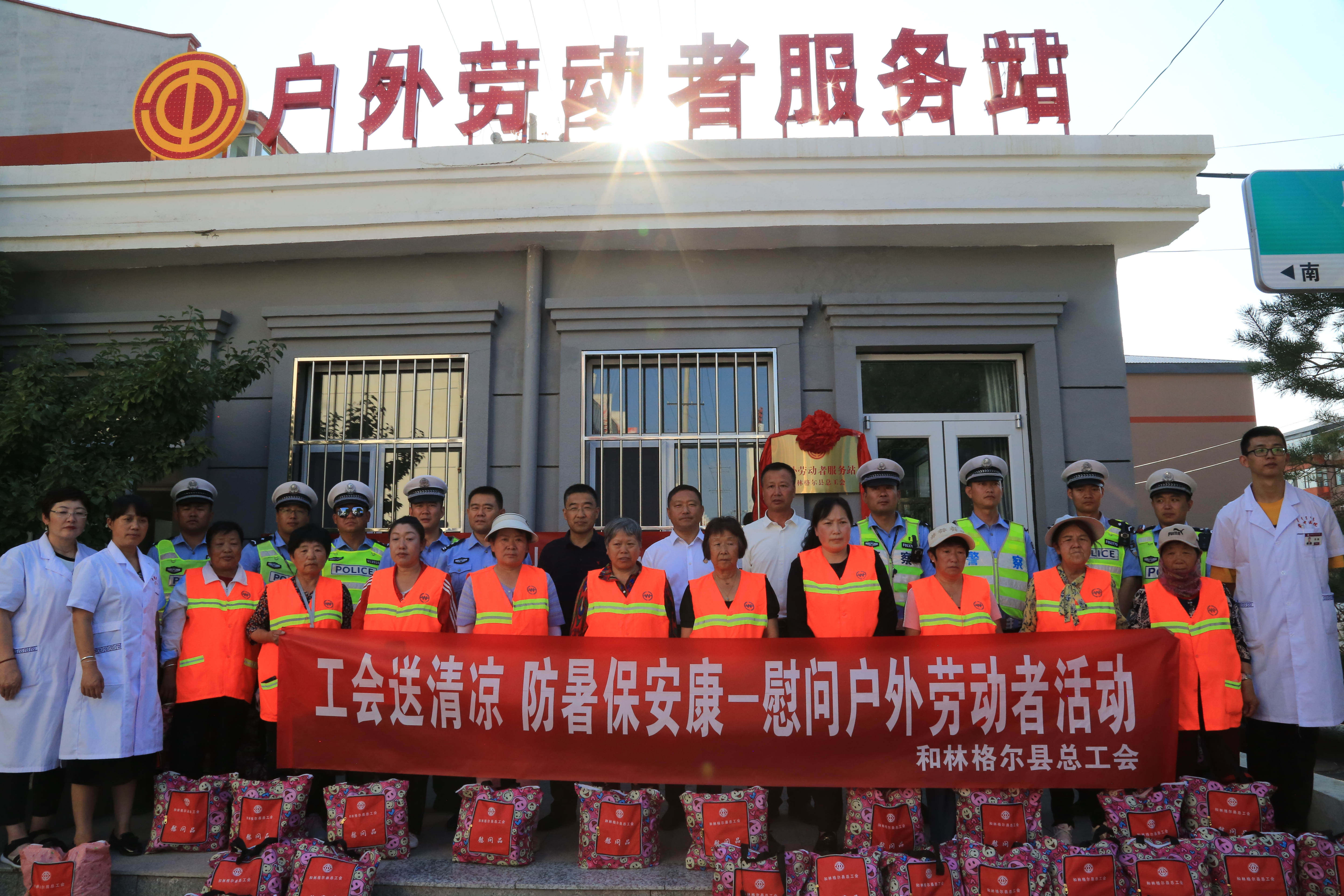 入夏以来,高温天气持续不断,交通警察、环卫工人等户外劳动者冒酷暑、战热浪,用汗水诠释着责任与担当,用劳动为建设全国文明县城添砖加瓦。为切实维护高温期间广大职工的劳动健康权益,充分发挥工会户外劳动者服务站的辐射功能,7月18日,和林格尔县总工会举办户外劳动者服务站揭牌仪式暨“工会送清凉 防暑保安康”——关爱高温天气劳动者慰问活动。和林格尔县人大常委会副主任、总工会主席蒲喜万,县总工会党组书记伊俊文,县环卫局,县交警大队有关领导参加活动。