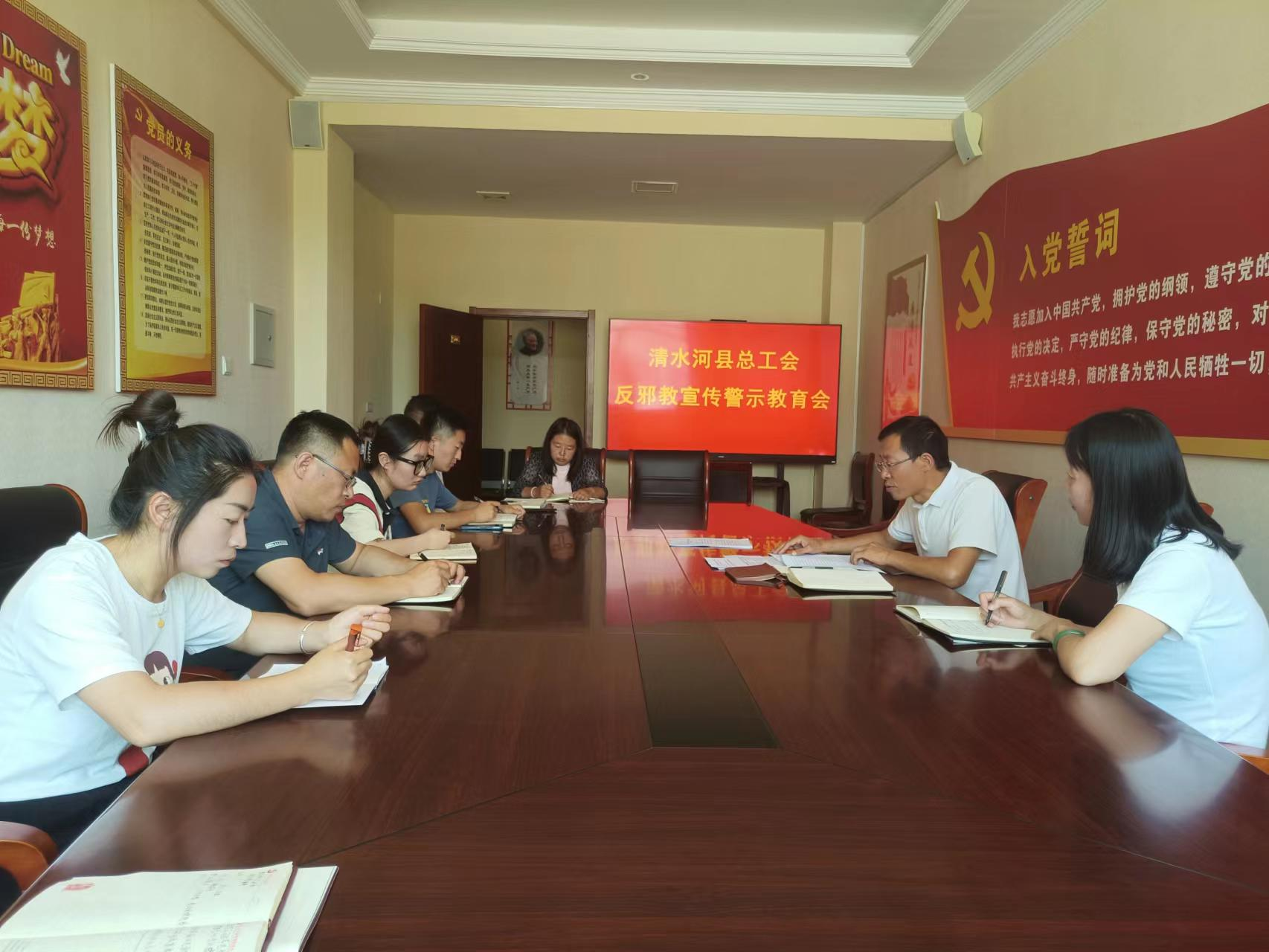 7月24日上午,清水河县总工会召开“反邪教”宣传警示教育工作会。会议指出,要积极向广大群众宣传邪教的特征、危害,正确识别邪教组织、正确辨别邪教与宗教等,更加清醒地认识到各种邪教组织蛊惑人心,蒙蔽群众,反对科学的嘴脸,增强自觉抵制邪教的意识。坚持以党建带诚信建设的主基调,不断提升工作质量。
