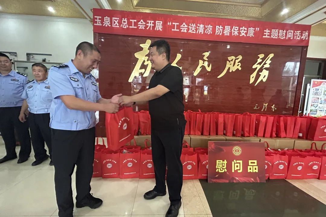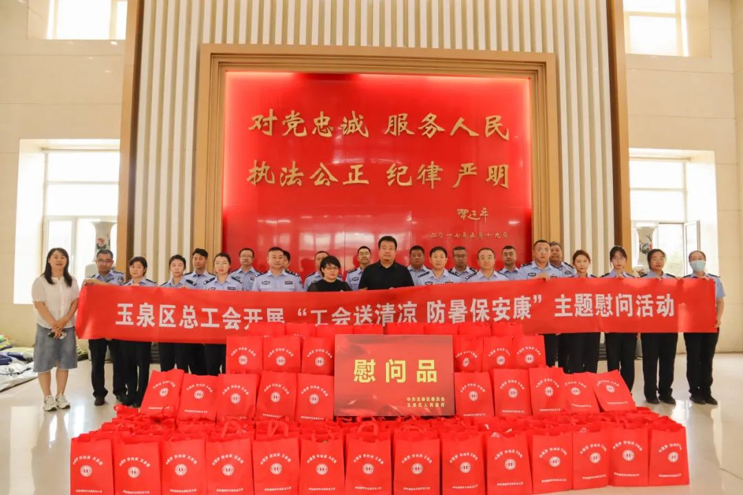 为切实做好高温期间职工劳动保护和防暑降温工作,8月4日,玉泉区总工会开展“工会送清凉 防暑保安康”送清凉系列慰问活动,玉泉区委副书记、区政法委书记敖登,玉泉区总工会主席崔明霞等一行先后前往玉泉区交警大队、玉泉区公安分局和街道办事处看望慰问一线交警、公安干警和基层社区工作者,为他们送去了茶叶、冰糖、绿豆等防暑降温慰问物资,并送上政府和工会组织对一线职工的浓浓关怀。