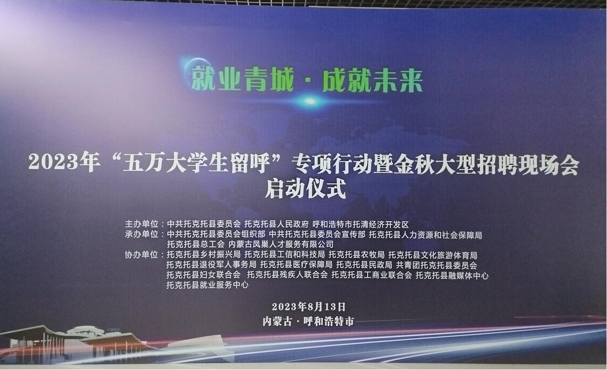 为全面贯彻习近平总书记考察内蒙古的重要讲话精神,落实党中央、国务院稳就业保就业决策部署,8月13日上午由托克托县委、县政府主办,托克托县委组织部、县委宣传部、县总工会、县人力资源和社会保障局承办的2023年“五万大学生留呼”工程专项行动暨金秋大型线上线下招聘会在托克托县总工会工人文化宫成功举办。