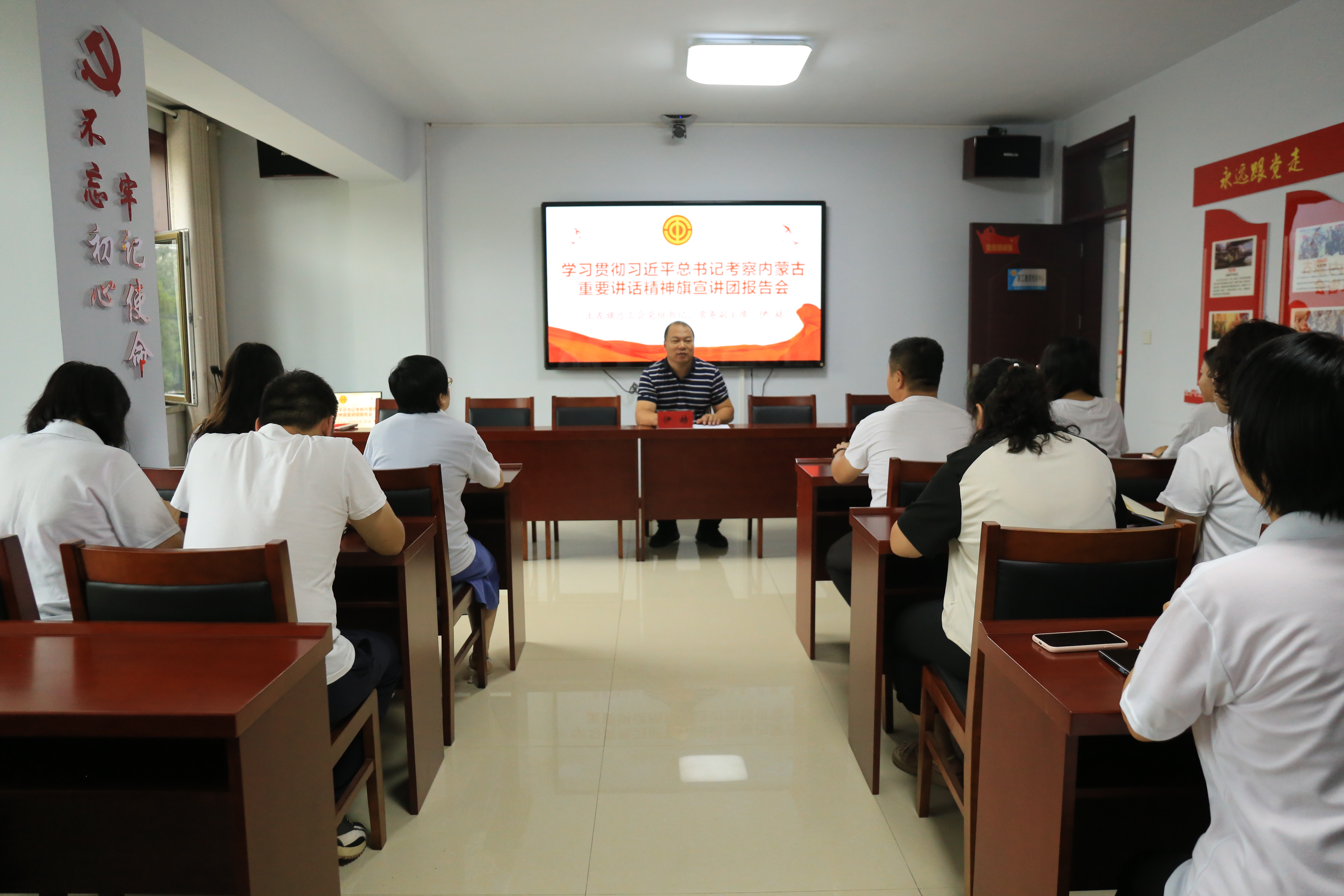 土左旗总工会党组书记、常务副主席伊赫以《牢记嘱托 奋力书写中国式现代化内蒙古新篇章》为题,围绕“深切感悟习近平总书记对内蒙古的关心厚爱,深刻领会习近平总书记重要讲话的丰富内涵和实践要求,以办好两件大事为牵引推动习近平总书记重要讲话精神落地落实”三个方面作主题宣讲。