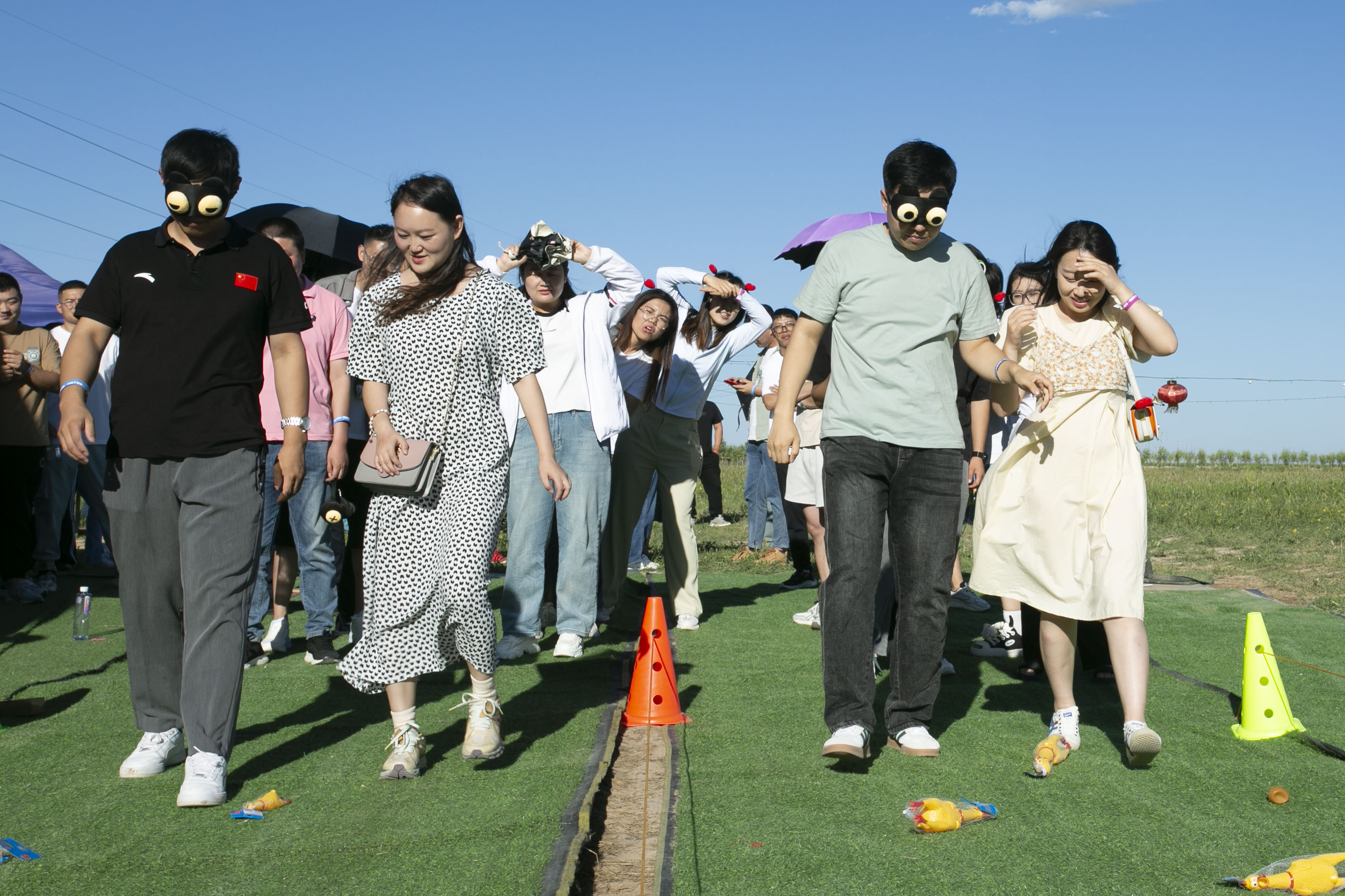 “默契大挑战”:一方蒙眼,另一方引导保持牵手动作、或公主抱、或背起方式,通过路障后投喂西瓜。