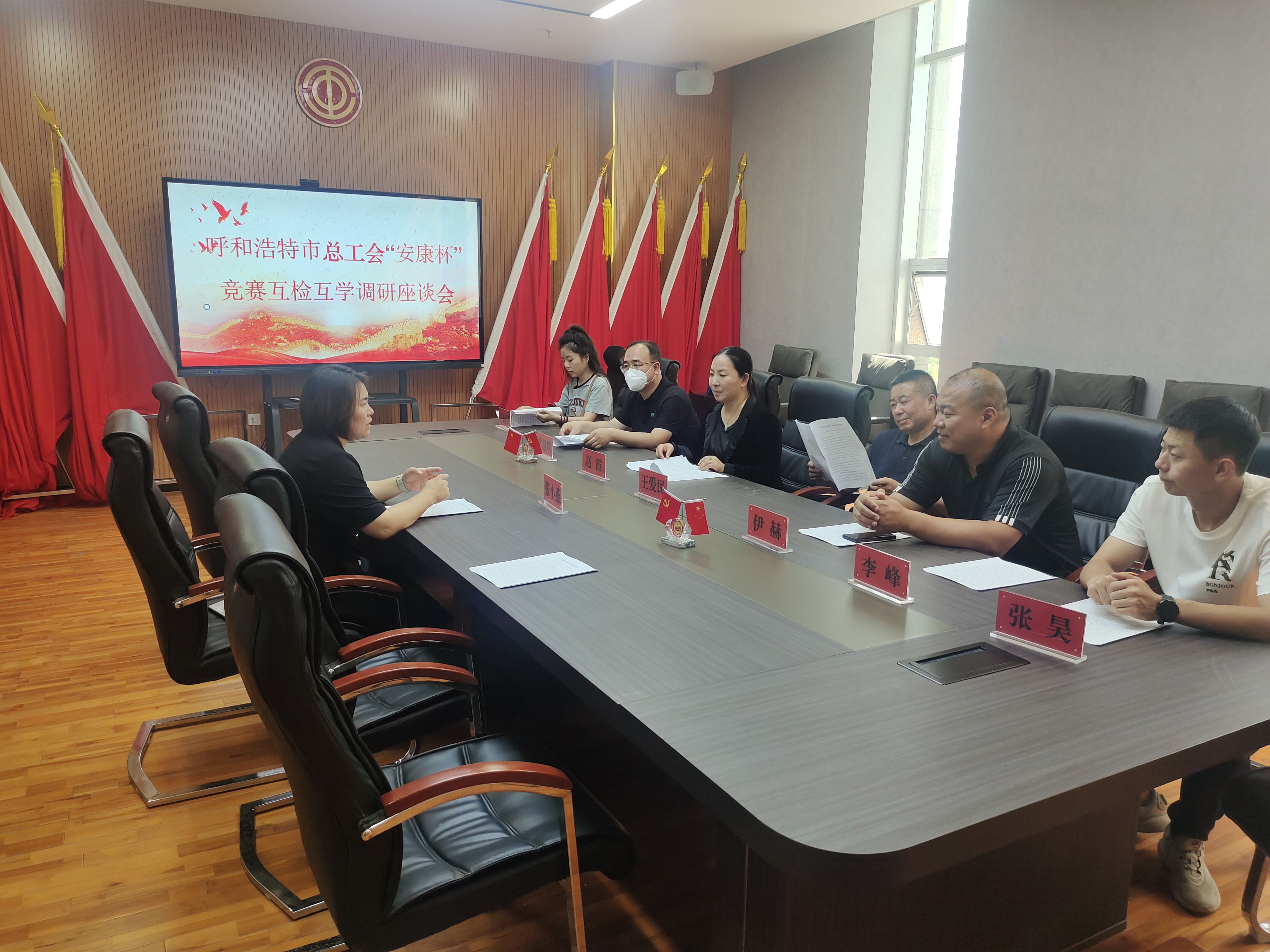 8月22日上午,市总工会劳动保护部部长王爱民,土左旗总工会党组书记、副主席伊赫、清水河县总工会副主席赵霞、回民区总工会副主席李峰等一行深入我县就“安康杯”竞赛活动的开展情况进行调研,托克托县总工会副主席张小燕陪同调研。