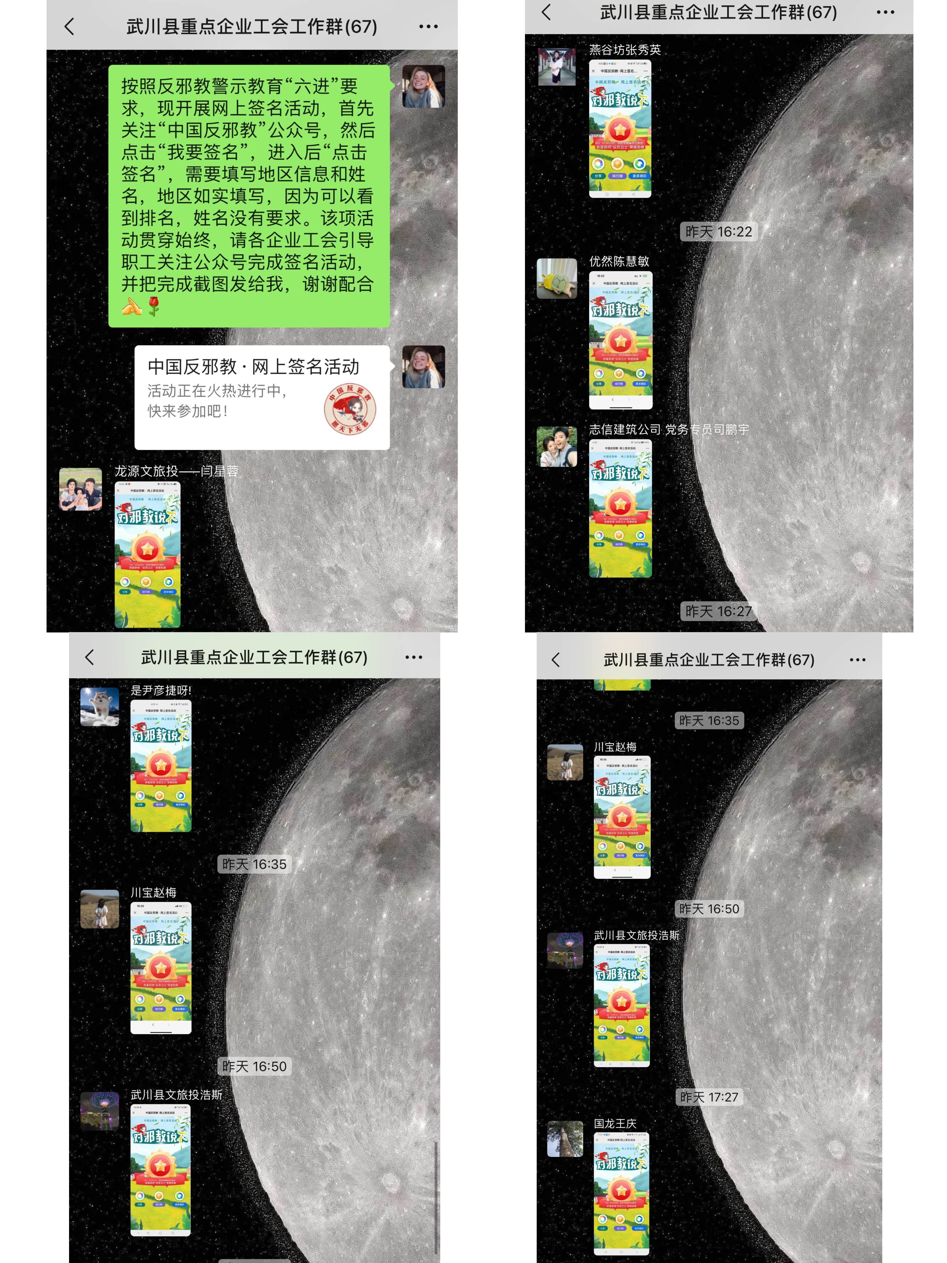 活动中,武川县总工会利用微信群积极转发“中国反邪教”微信公众号二维码及网上签名活动操作流程,发动各企业工会通过扫码关注公众号,在公众号中参与“对邪教说不”网上签名活动。