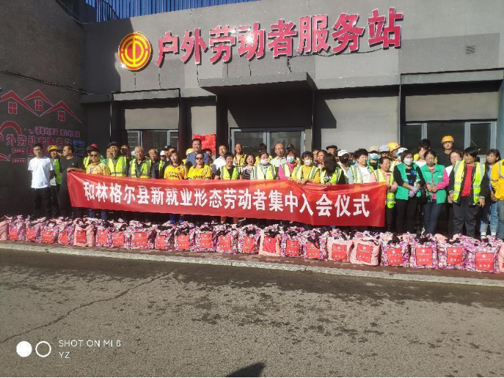 为切实维护新就业形态劳动者合法权益,最大限度地将新就业形态劳动者组织到工会中来,推动新就业形态劳动者建会入会和权益保障机制的建立健全,加大对新就业形态劳动者关心关爱工作力度,9月9日,和林格尔县总工会在县人民体育场户外劳动者服务站举行“和林格尔县新就业形态劳动者集中入会仪式”并开展慰问活动。和林格尔县总工会党组成员、副主席孙瑞主持仪式,县总工会党组书记伊俊文、和林格尔县盛乐国有资本投资运营有限公司党支部书记张克、董事长兼总经理杨文斌、工会主席王云霞、县总工会基层部部长燕云丽参加活动。