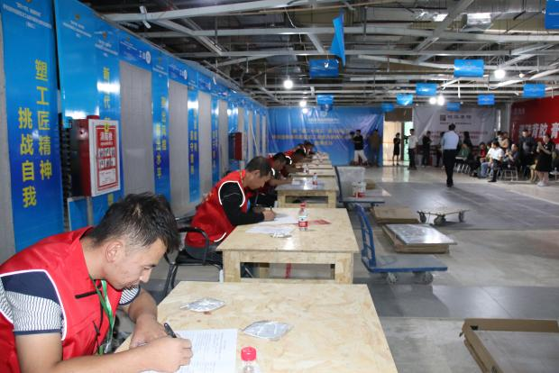 在比赛现场,选手们精神抖擞、争分夺秒地投入到竞赛中。只见他们仔细量好墙面位置,熟练地涂抹平整水泥浆,把两种颜色的瓷砖铺贴在墙面上;同时小心切割打磨,最后拼贴出“业”字图案。参赛选手王师傅说:“这既是比赛,也是一次非常难得的学习机会。在比赛中能够以赛会友,交流经验切磋技艺,学他人之长,补自己之短,我一定会拿出自己的最佳水平赛出风采。”。