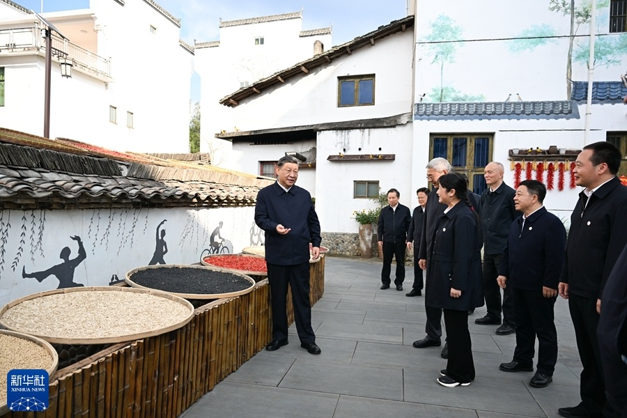 10月10日至13日,中共中央总书记、国家主席、中央军委主席习近平在江西考察。这是11日下午,习近平在上饶市婺源县秋口镇王村石门自然村考察。新华社记者 谢环驰 摄11日下午,习近平来到上饶市婺源县秋口镇王村石门自然村。这里是饶河源国家湿地公园的中心区,也是极度濒危鸟类蓝冠噪鹛自然保护小区,植被多样、生态良好。习近平详细了解湿地公园和蓝冠噪鹛保护等情况。村广场上正在“晒秋”,一排排晒盘盛满红豆、玉米、辣椒等,格外喜人。美术学院师生正在采风写生,习近平驻足观看,同他们亲切交流,鼓励他们打好扎实基本功。得知当地发展特色旅游、茶产业,推进乡村振兴成效显著,习近平十分高兴。他指出,优美的自然环境本身就是乡村振兴的优质资源,要找到实现生态价值转换的有效途径,让群众得到实实在在的好处。乡村要振兴,关键是把基层党组织建好、建强。基层党组织要成为群众致富的领路人,确保党的惠民政策落地见效,真正成为战斗堡垒。