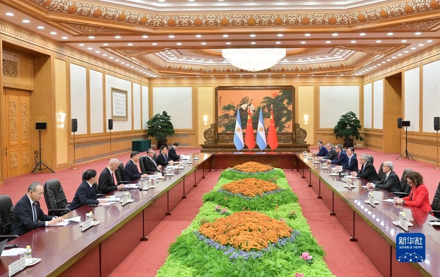 习近平指出,中阿建交50多年来,双方始终相互尊重、平等相待、互利共赢。近年来,在我们共同引领下,中阿关系不断迈上新台阶。中阿同为发展中大国,都肩负着推动国家发展振兴、实现人民对美好生活向往、维护国际公平正义的历史使命。中方愿同阿方一道,加强战略对接,推动中阿关系行稳致远,树立全球南方国家团结合作的典范。中方支持阿根廷维护经济金融稳定,愿同阿方分享发展机遇,推动高质量共建“一带一路”,深化农业、基础设施等领域务实合作。中方愿进口更多阿根廷优质产品,鼓励更多中国企业赴阿投资。