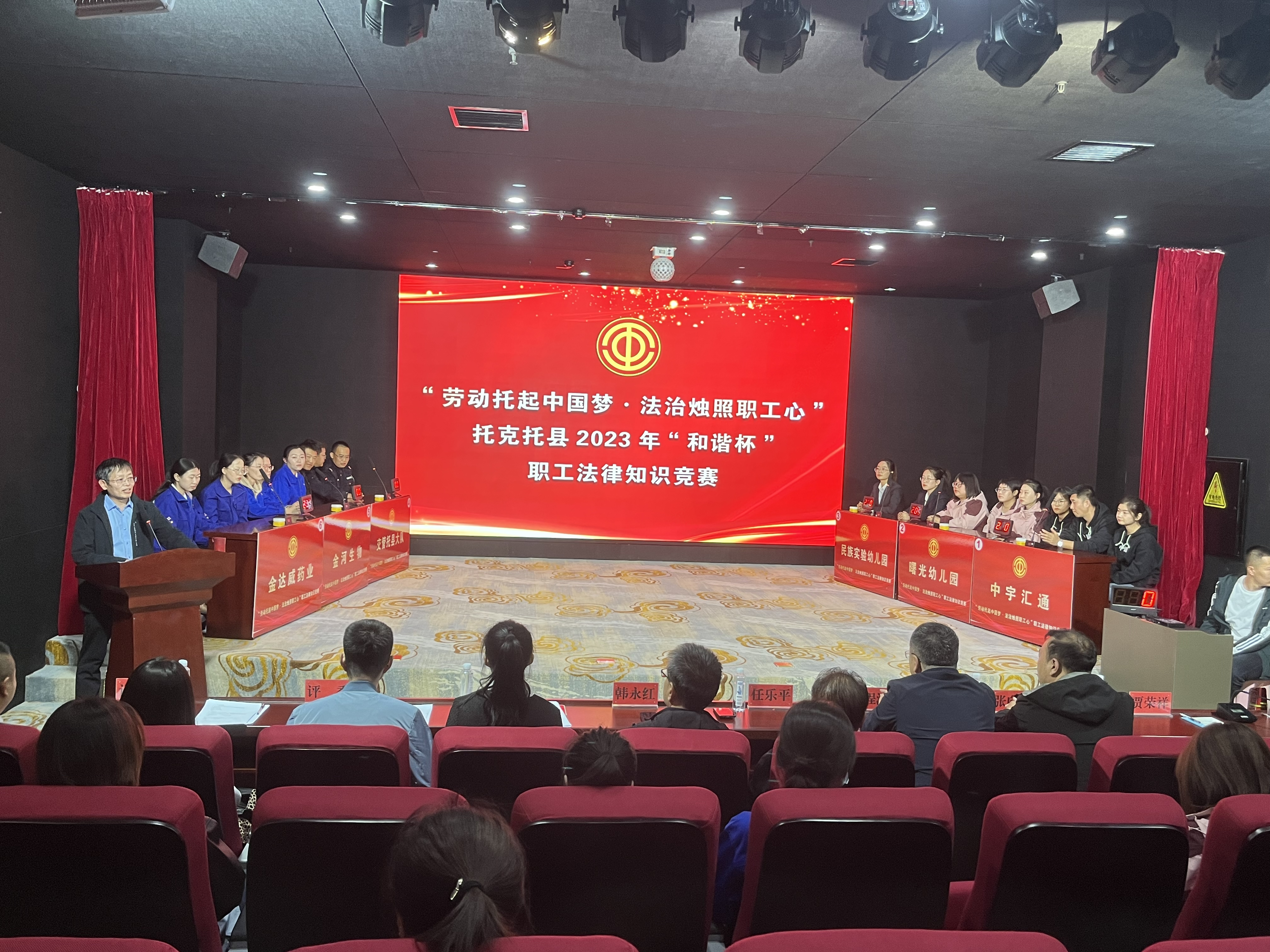 为贯彻落实习近平法治思想,加强职工法治宣传教育,夯实中国特色社会主义法治道路的群众基础,引导广大职工群众自觉尊法学法守法用法。10月19日,托克托县总工会在工人文化宫举办“劳动托起中国梦·法治烛照职工心”托克托县2023年“和谐杯”职工法律知识竞赛。县委统战部副部长任乐平,县司法局副局长程鸿旺,县人力资源和社会保障局副局长韩永红,县应急管理局副局长张向东出席本次活动,县总工会副主席贾荣祥致词。
