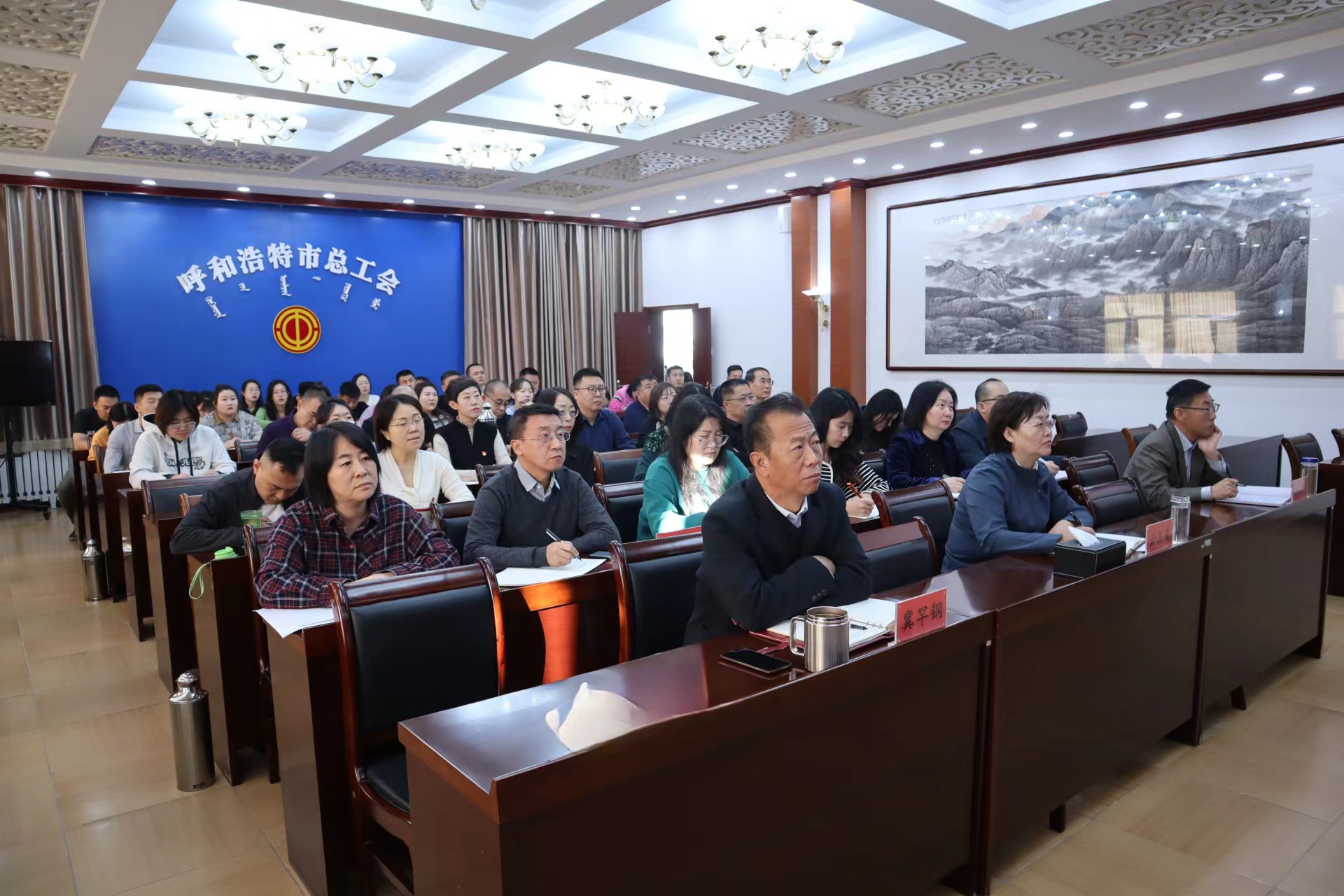 11月14日,全国总工会召开“学习贯彻中国工会十八大精神”专题直播辅导报告会。呼和浩特市总工会设置21个分会场,组织全市各旗县区、开发区、各乡镇街道办事处工会干部、社会化工作者930余人观看直播培训辅导报告会,呼和浩特市人大常委会副主任、总工会主席云玉美,呼和浩特市总工会党组成员、副主席冀罕钢在市总工会同机关干部观看报告会。