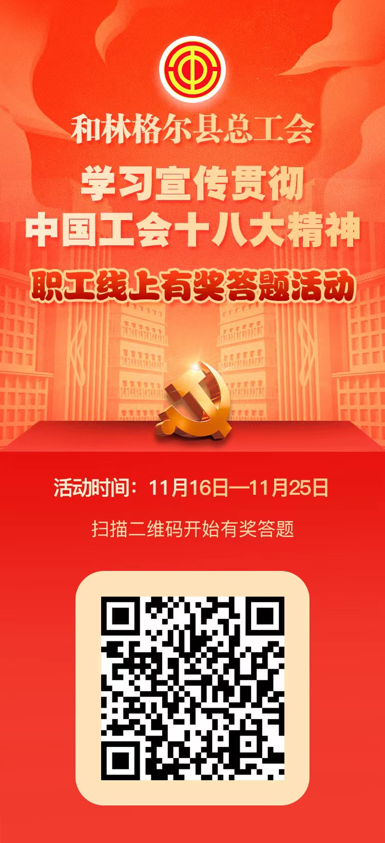 为在全县工会干部和职工群众中掀起学习宣传贯彻习近平总书记同全总新一届领导班子成员集体谈话时的重要讲话精神和中国工会十八大精神热潮,凝聚起广大职工奋进新征程的磅礴伟力,县总工会经研究,决定开展学习宣传贯彻中国工会十八大精神有奖答题活动,现将具体事宜通知如下:
