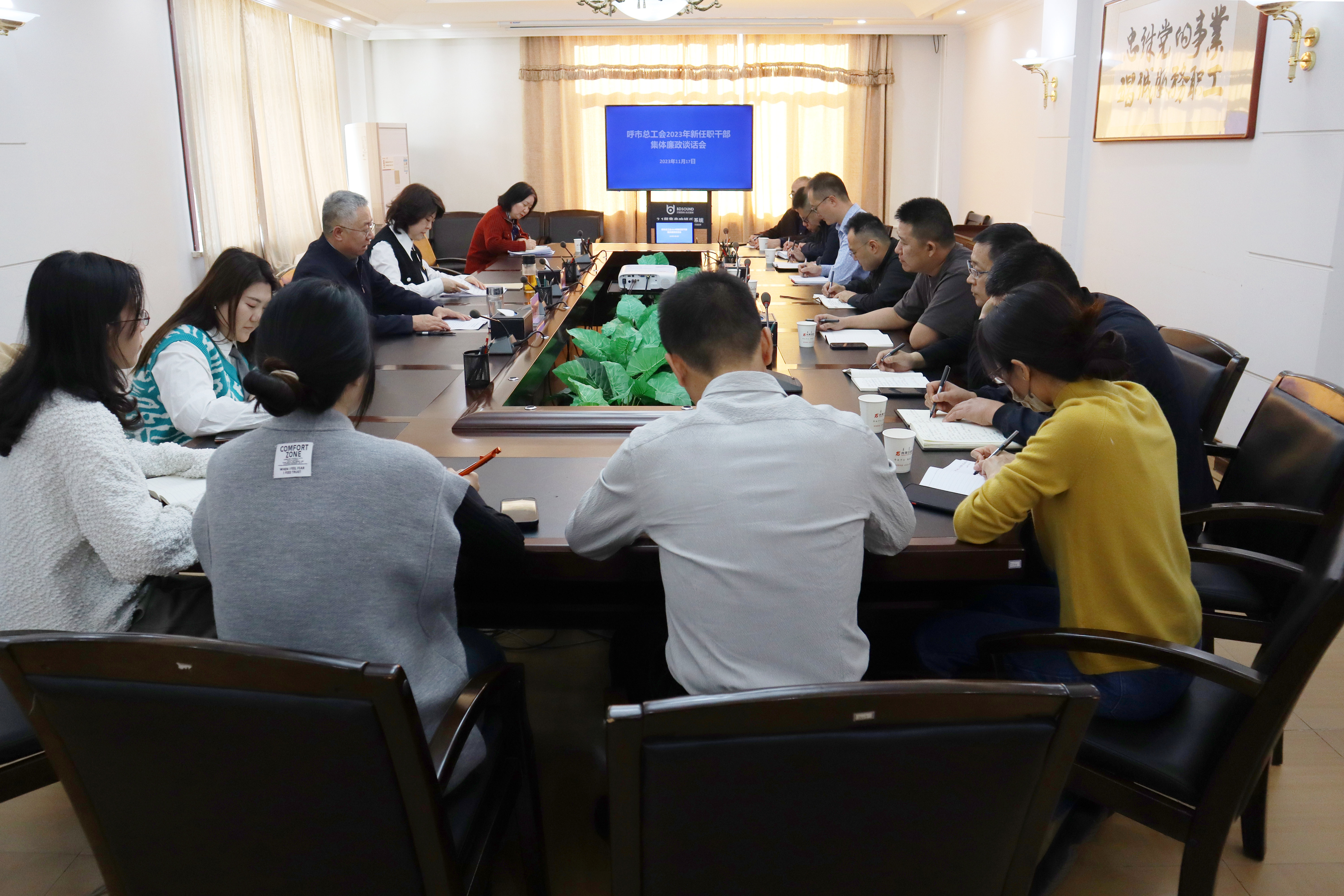 11月17日,呼和浩特市总工会召开新任职干部集体廉政谈话会。呼和浩特市总工会党组书记、副主席汪俊亭主持并讲话,呼和浩特市纪委监委派驻市人大常委会机关纪检监察组组长宝欣出席会议并讲话。