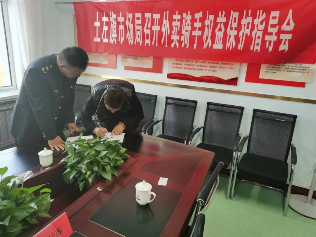 “平台企业应担负起保障劳动收入、劳动安全、社会保障等方面责任义务;完善骑手权益保护条款;不得将最严重算法作为考核要求;优化平台派单机制……”。各部门立足自身职能职责,就平台企业及外卖配送直接涉及外卖骑手权益的制度规则、平台算法、劳动关系确立、交通安全规则等多方面的问题进行深入探讨,指导平台企业补充完善相关措施条款,保障外卖骑手合法权益。土左旗翔翔美团外卖平台企业现场签署了《土默特左旗市场监督管理局维护新业态劳动者劳动保障权益行政指导书》。