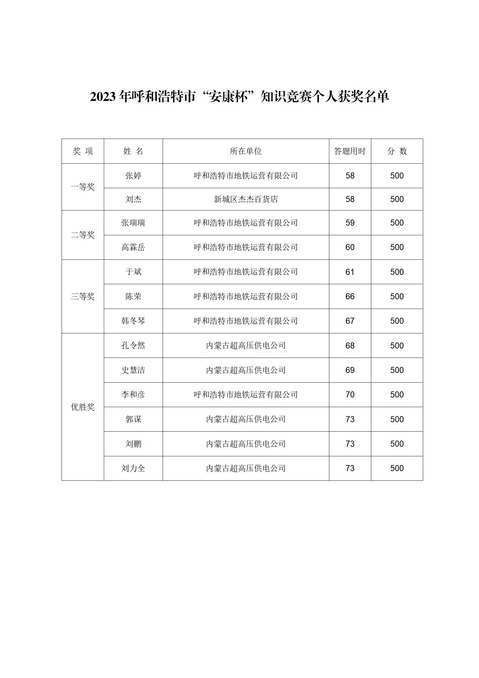 2023年呼和浩特市“安康杯”知识竞赛个人获奖名单、集体获奖名单