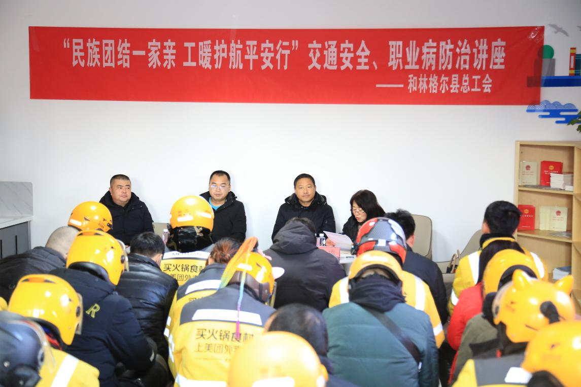 12月3日,和林格尔县总工会开展“民族团结一家新、工暖护航平安行”主题党日活动,邀请县中蒙医院副院长滕跃、县交警大队交警刘计平,在我县盛乐广场户外劳动者服务站为我县外卖配送人员及快递员举办交通安全、职业病防治讲座。县总工会党组书记伊俊文,党组成员、副主席孙瑞及全体党员参加。